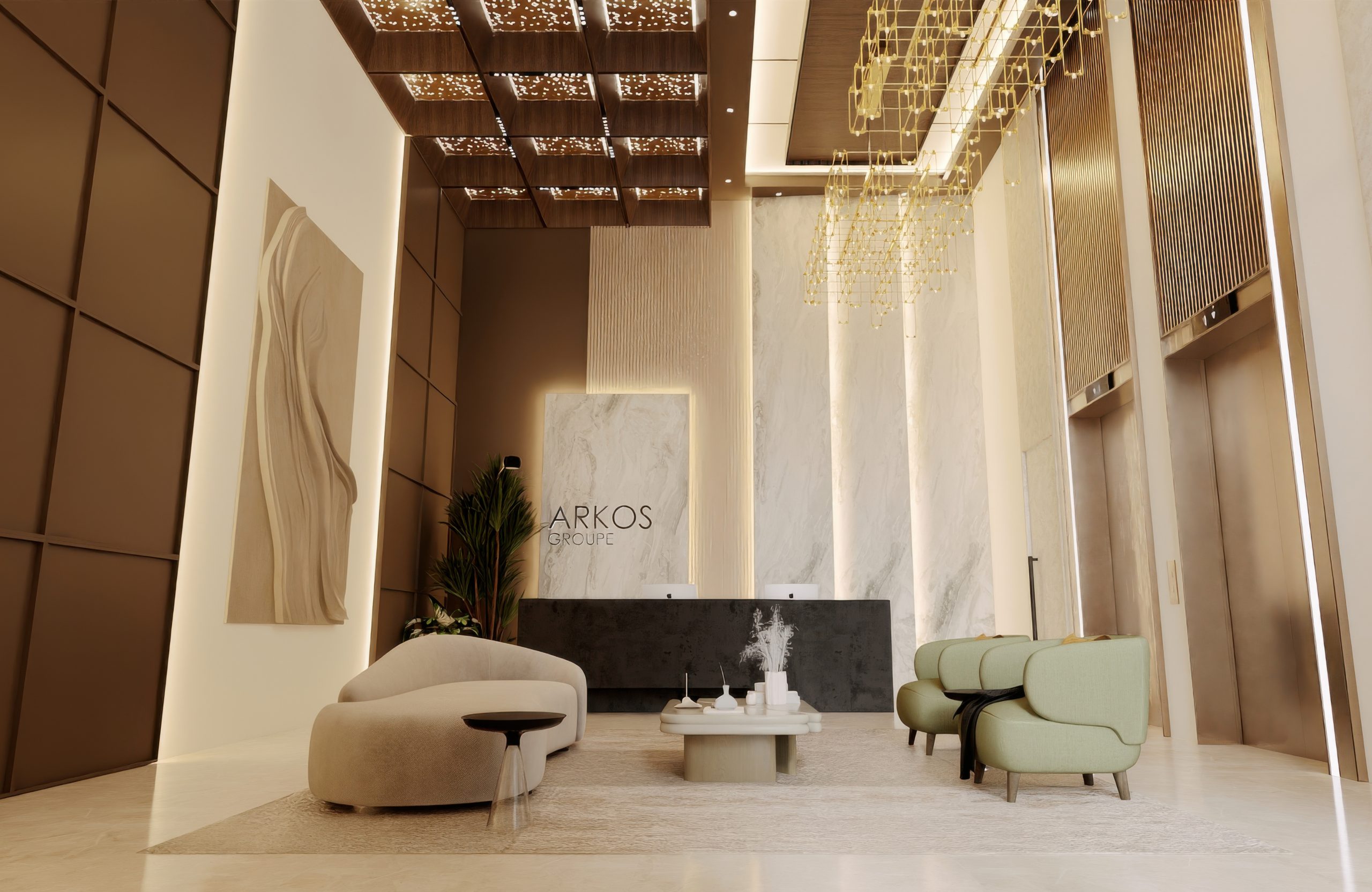 Le lobby raffiné accueille avec élégance et sérénité, offrant un espace d’attente confortable et un accès direct à la mezzanine